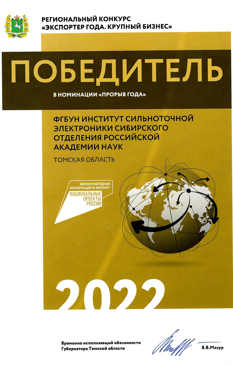Институт сильноточной электроники СО РАН стал победителем в региональном конкурсе «Экспортер года. Крупный бизнес» в номинации «Прорыв года».
